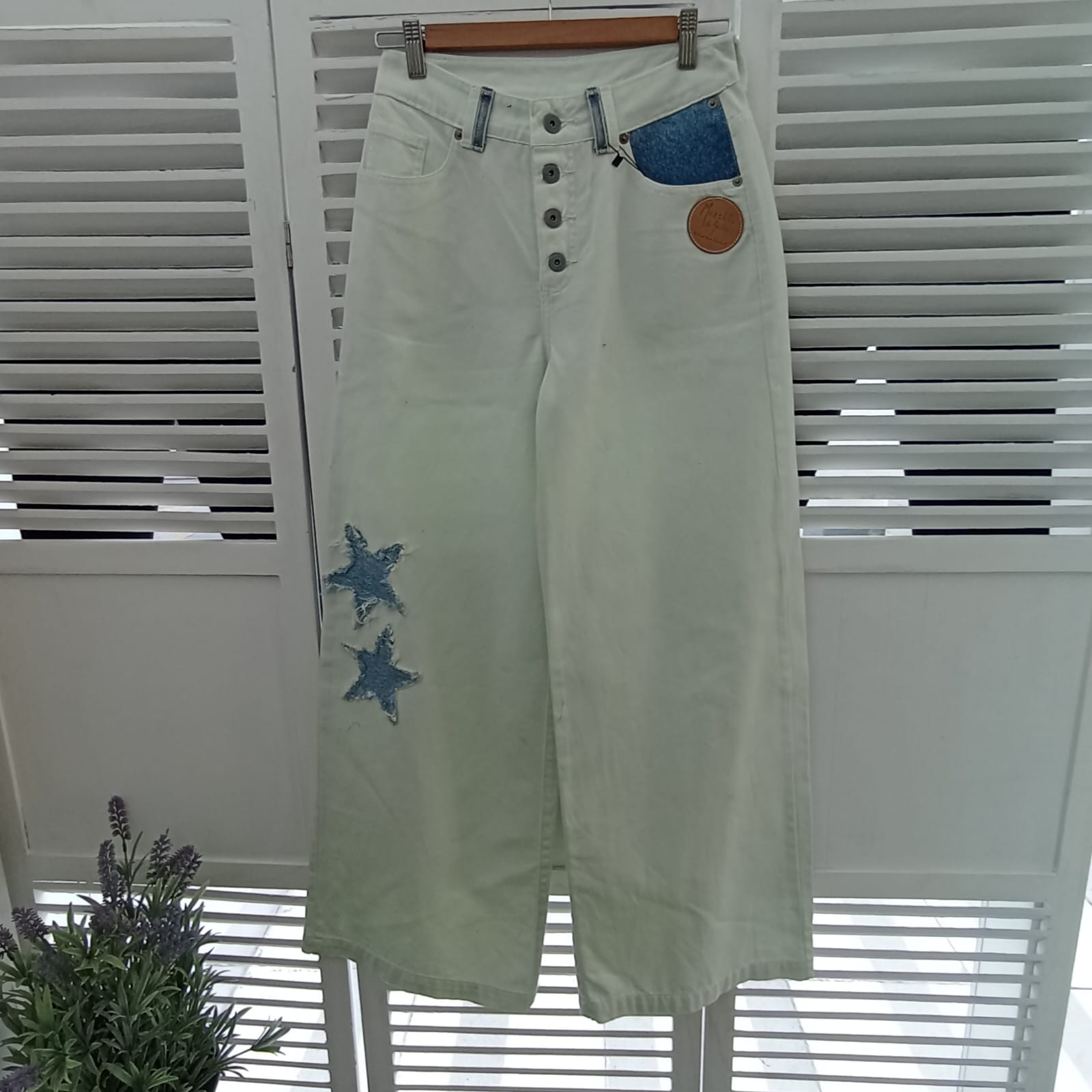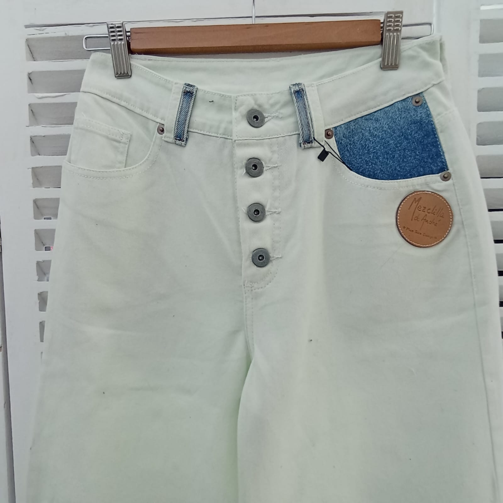 Prenda irrepetible y única, forma parte de la colección exclusiva "Mezclilla de André" que interviene desigualmente cada pieza una por una, en este caso con aplicaciones en tela de mezclilla. Se puede pagar vía web-pay de Transbank hasta en 12 cuotas sin intereses.