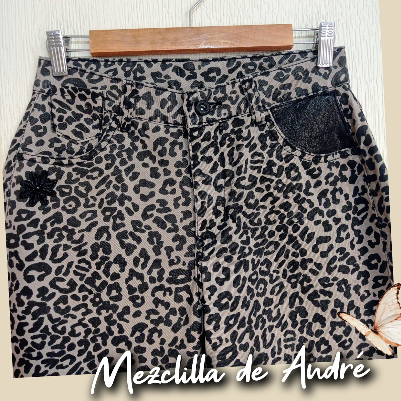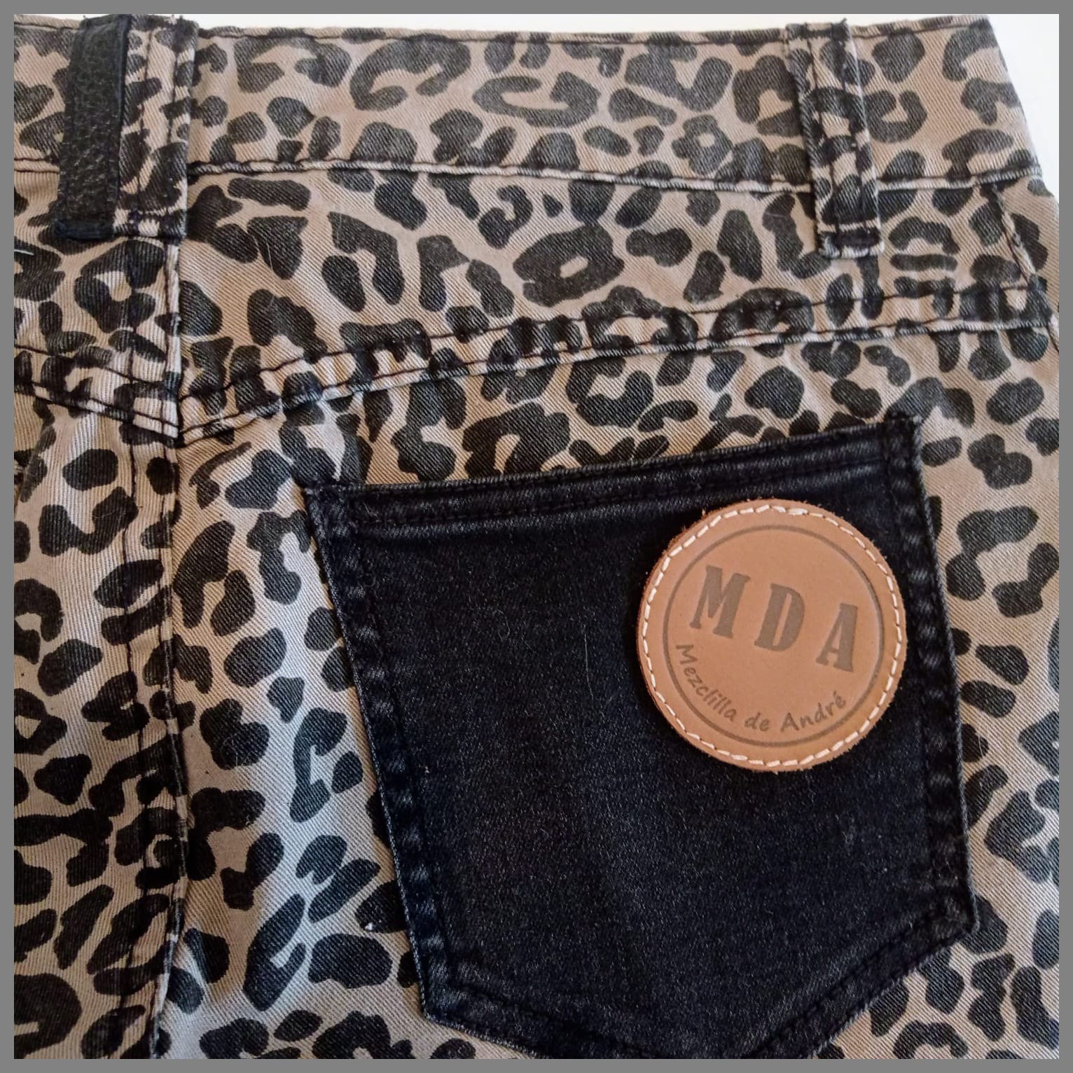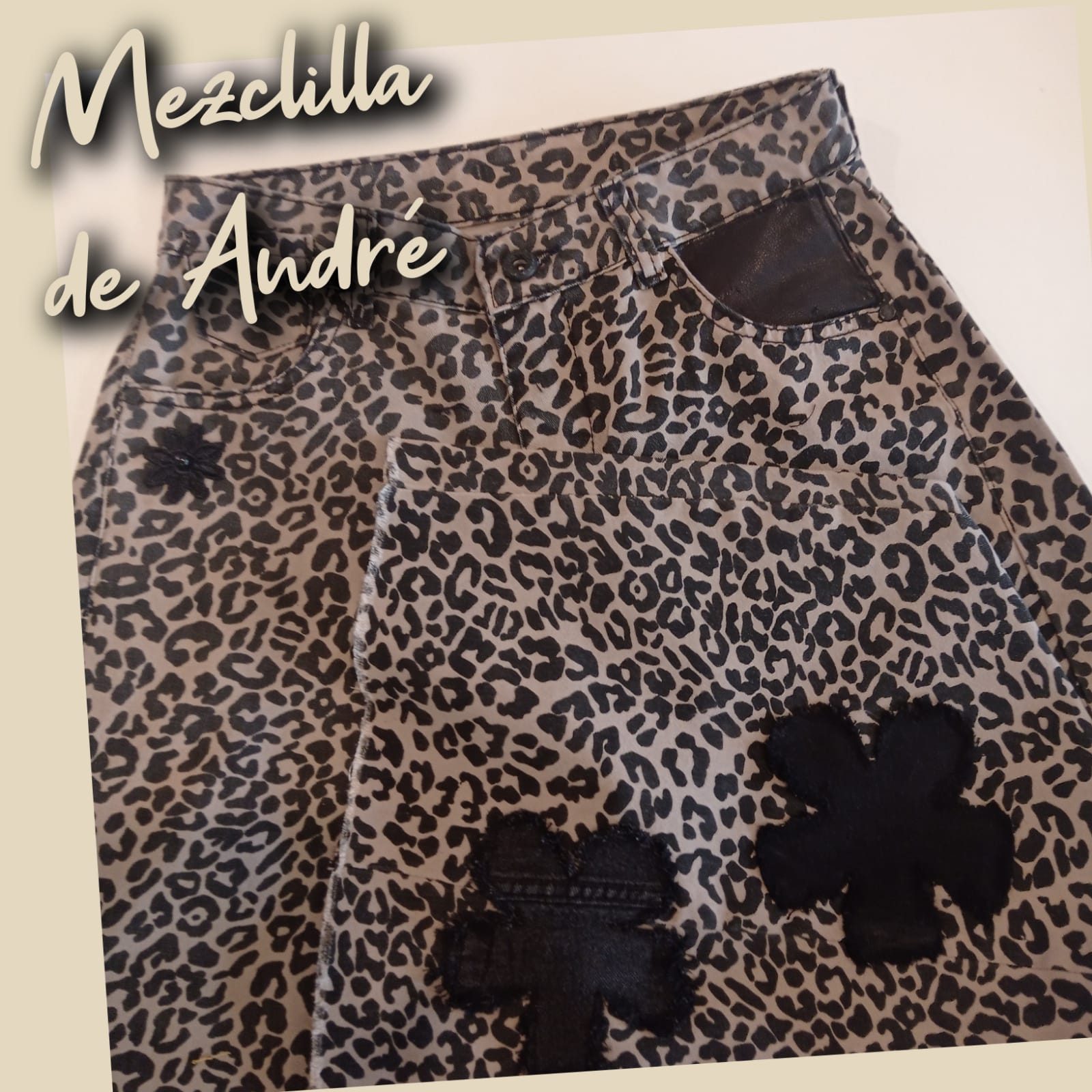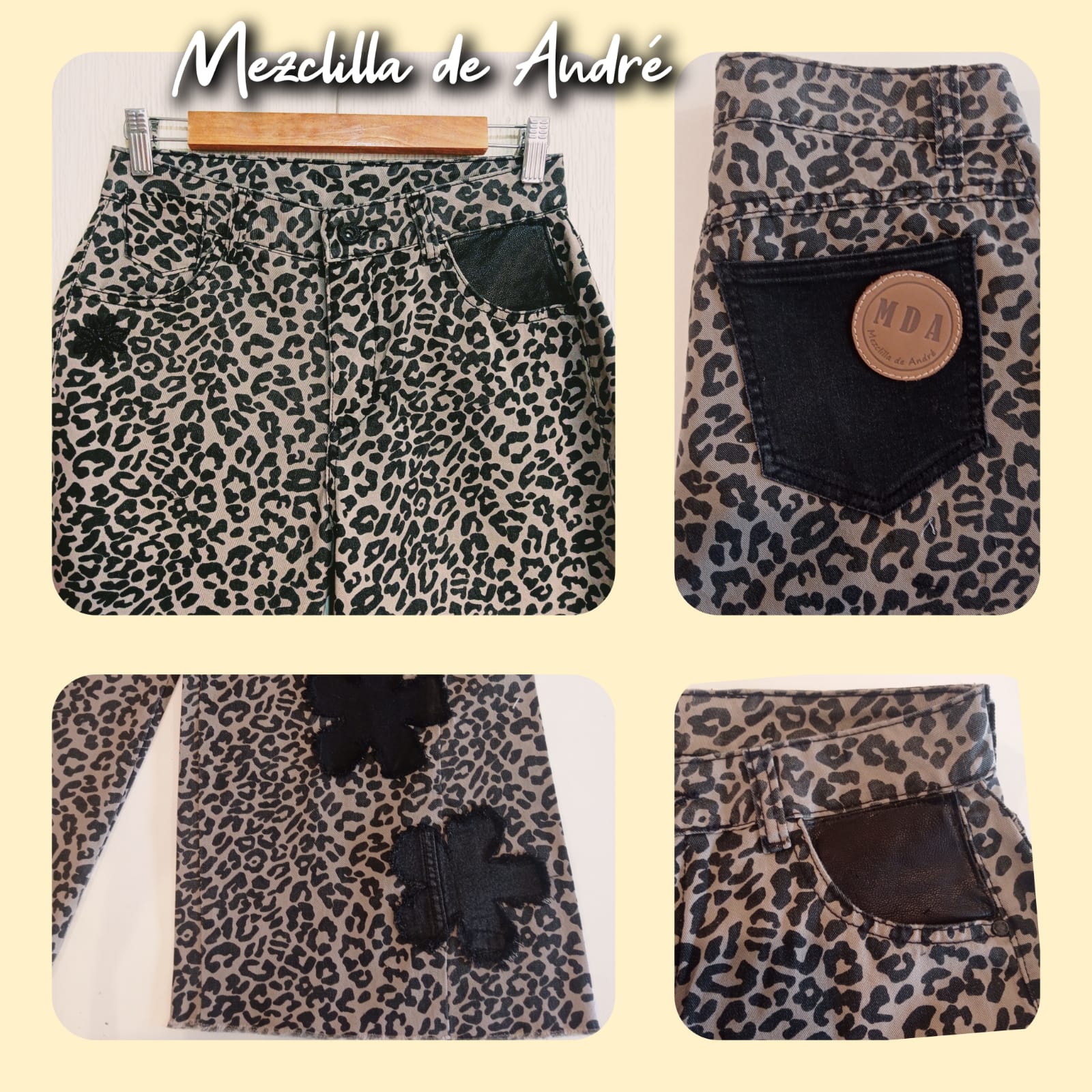 Prenda exclusiva y única forma parte de la colección "Mezclilla de André" que interviene desigualmente cada pieza una por una, en este caso con estampado y aplicaciones en tela y cuero genuino. Se puede pagar vía web-pay de Transbank hasta en 12 cuotas sin intereses.