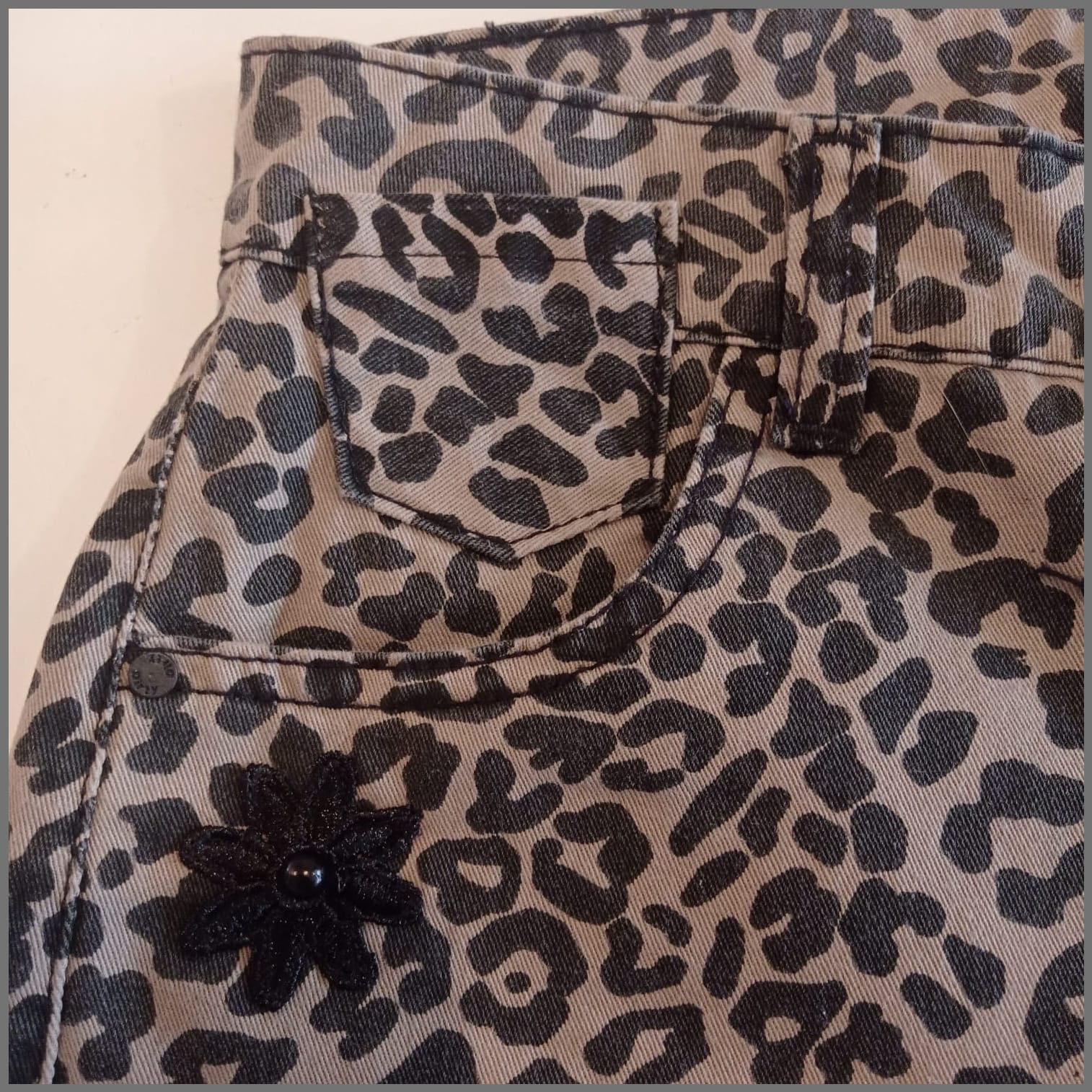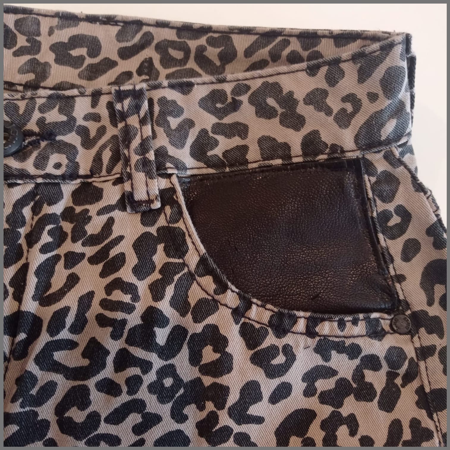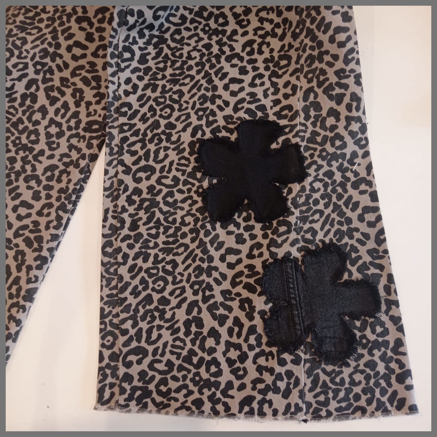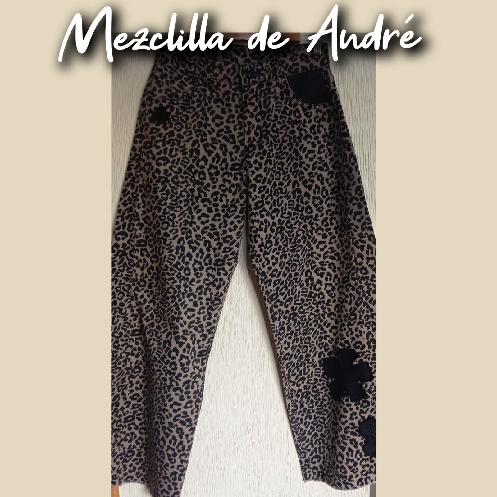 Prenda exclusiva y única forma parte de la colección "Mezclilla de André" que interviene desigualmente cada pieza una por una, en este caso con estampado y aplicaciones en tela y cuero genuino. Se puede pagar vía web-pay de Transbank hasta en 12 cuotas sin intereses.