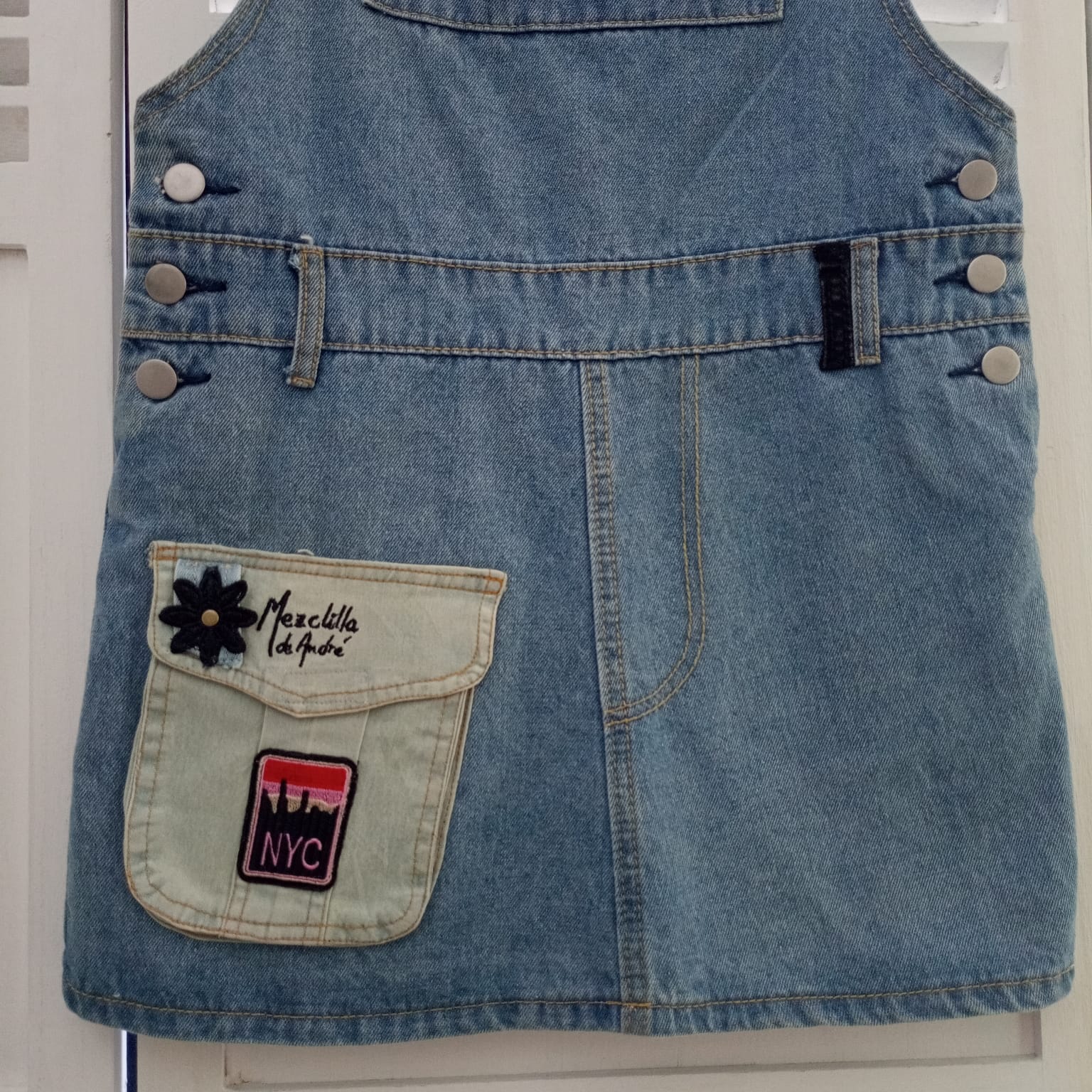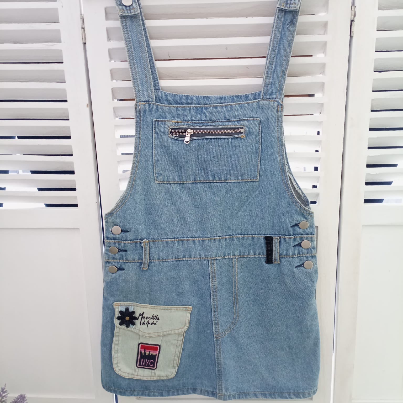 Jardinera falda exclusiva. forma parte de la colección"Mezclilla de André" que interviene desigualmente cada pieza una por una, en este caso con bolsillo en pechera y bolsillo de mezclilla para celular en falda Se puede pagar vía Webpay de Transbank hasta en 12 cuotas contado.