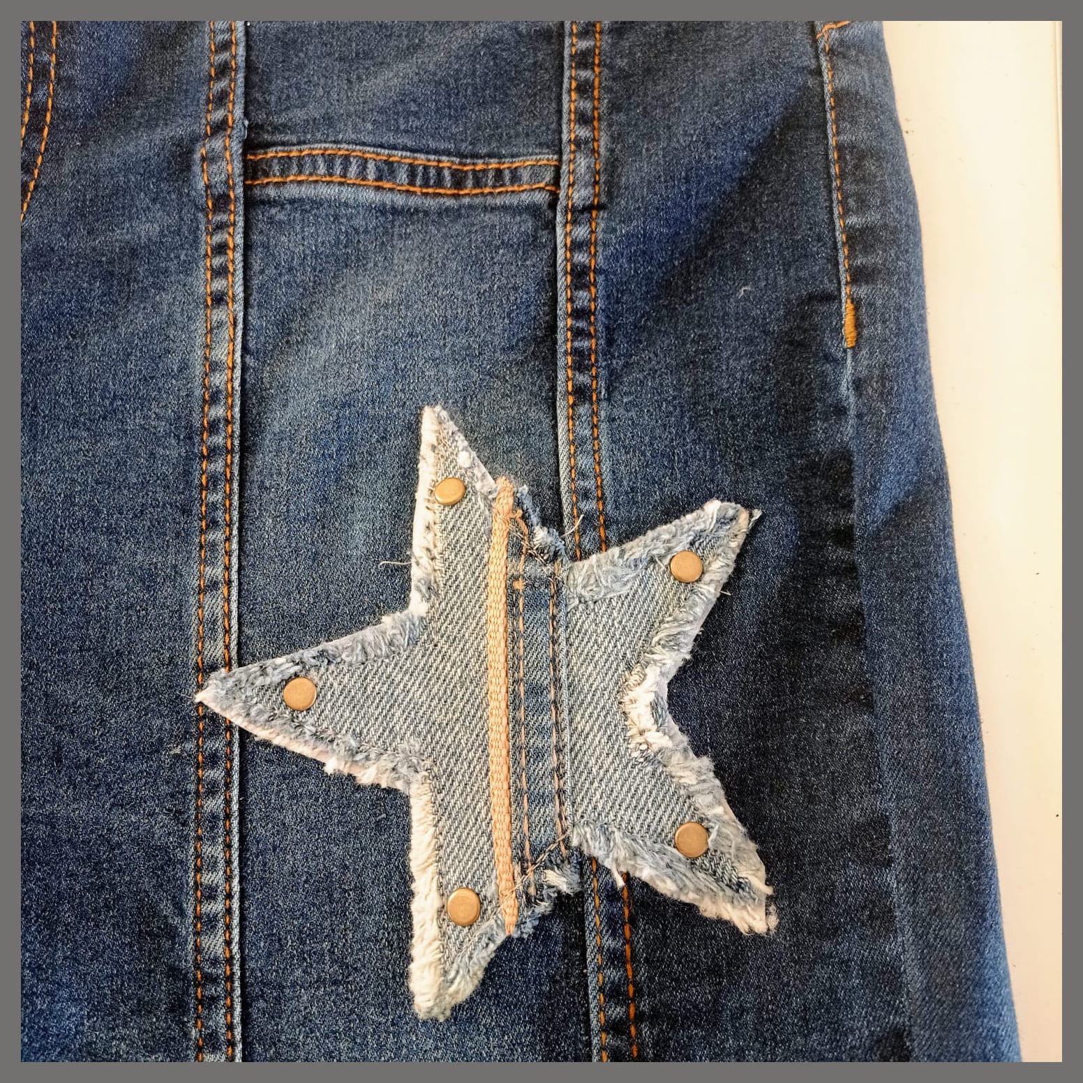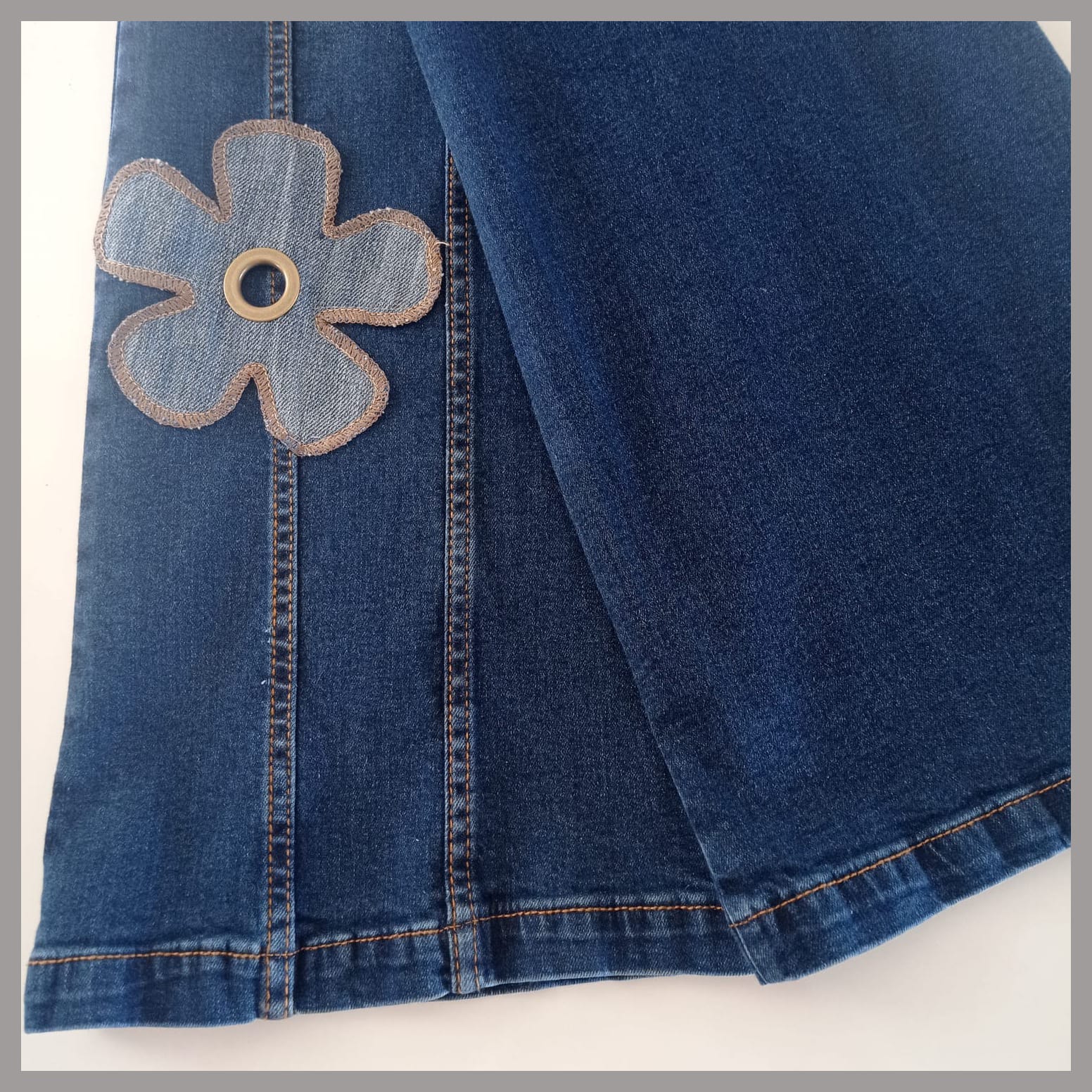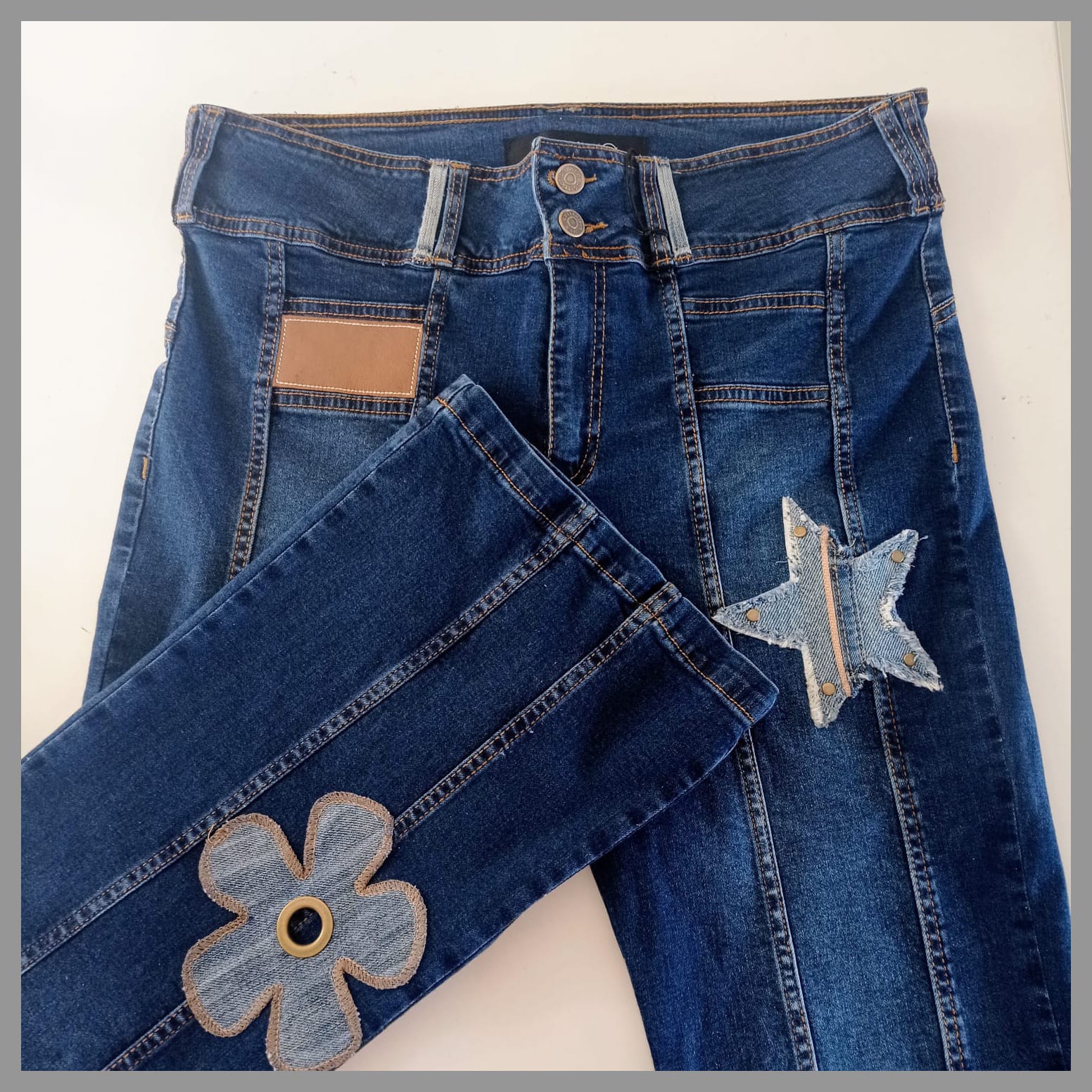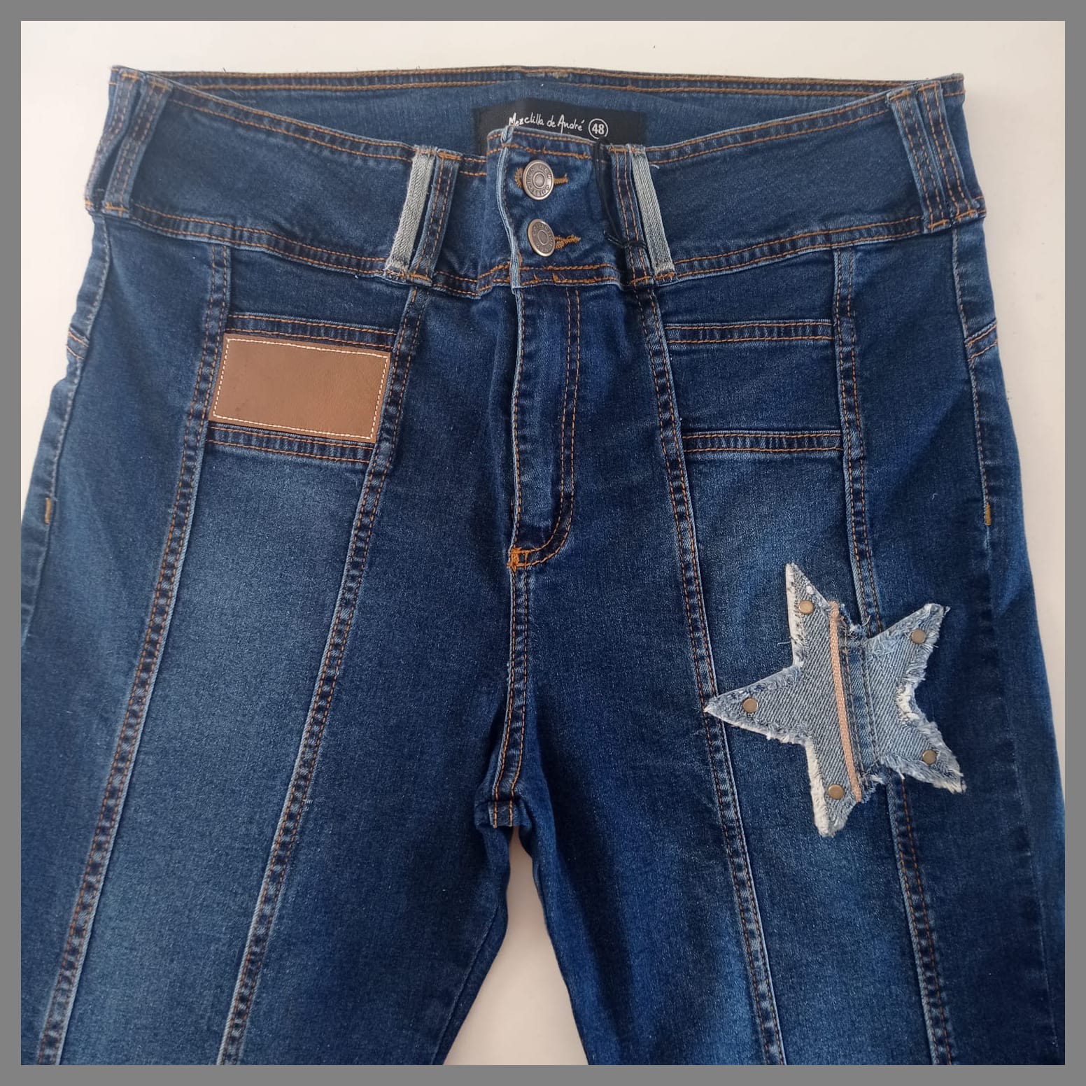 Prenda irrepetible y única, forma parte de la colección exclusiva "Mezclilla de André" que interviene desigualmente cada pieza una por una, en este caso con remaches y aplicaciones en tela y cuero genuino. Se puede pagar vía web-pay de Transbank hasta en 12 cuotas sin intereses.