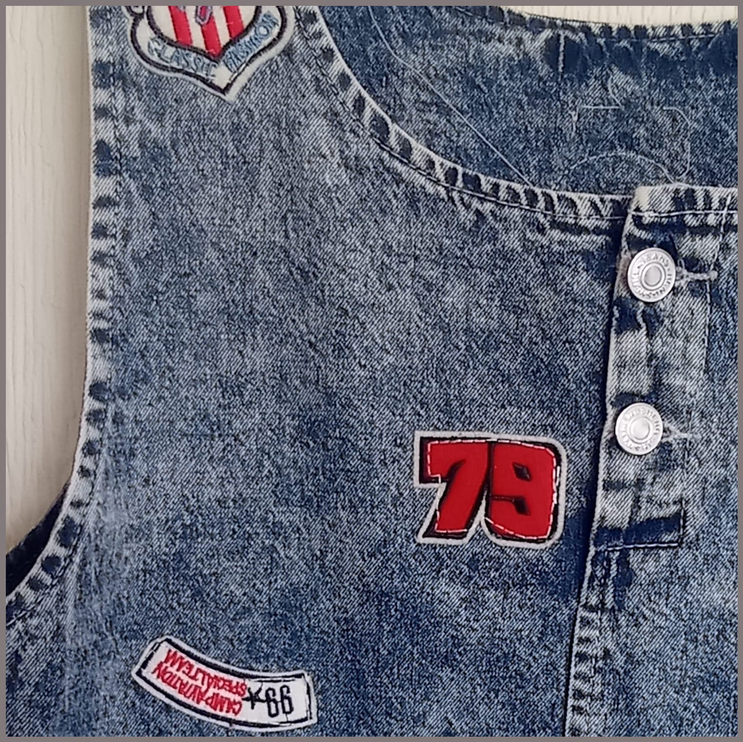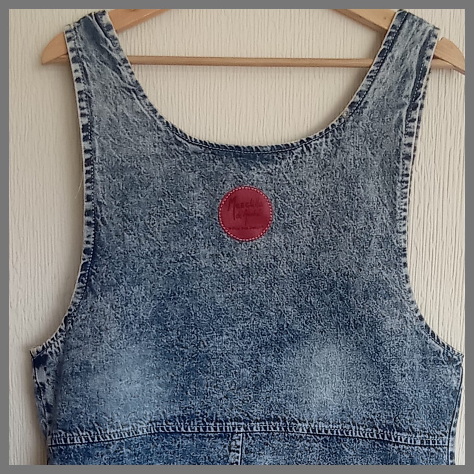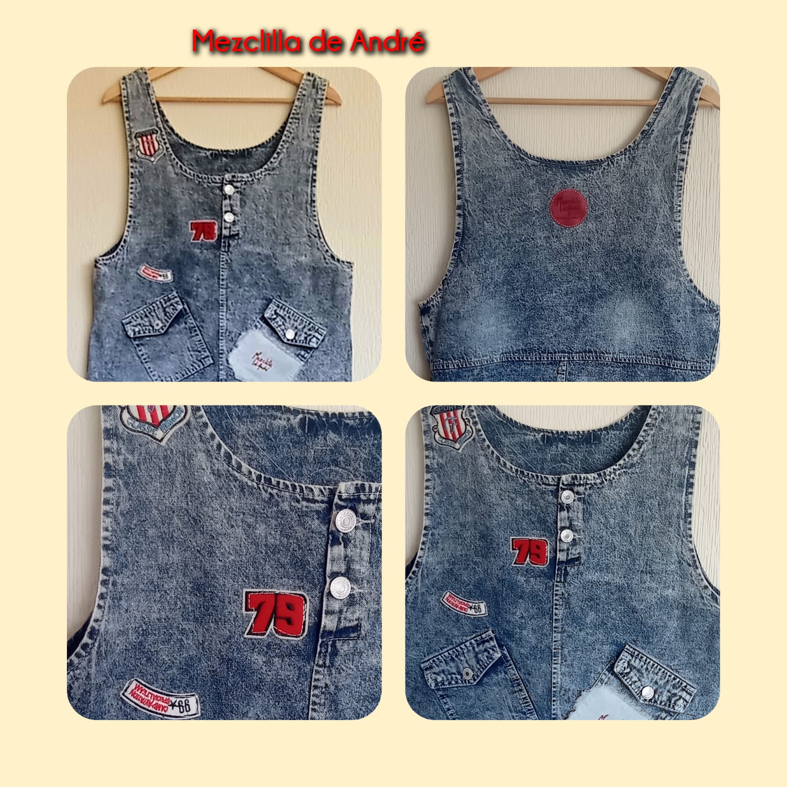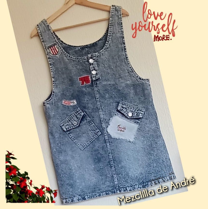 Playera exclusiva, forma parte de la colección "Mezclilla de André" que interviene desigualmente cada pieza una por una, en este caso con aplicaciones en tela. Se puede pagar vía Webpay de Transbank hasta en 12 cuotas contado.