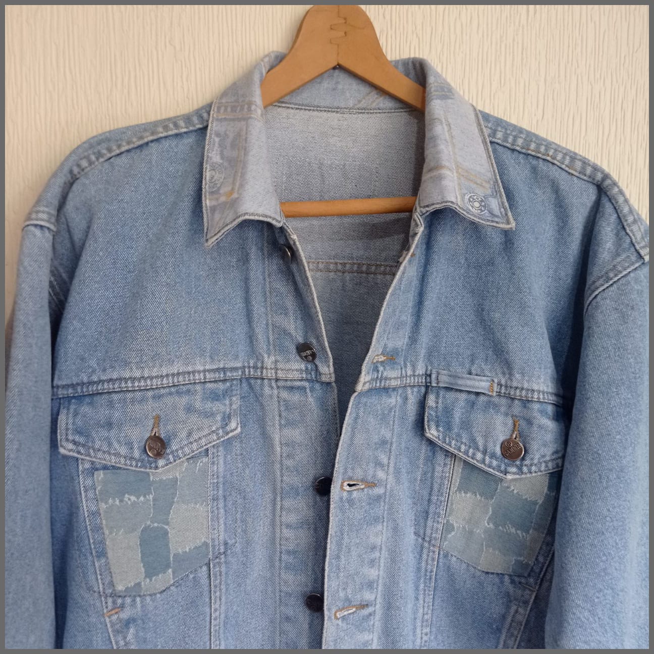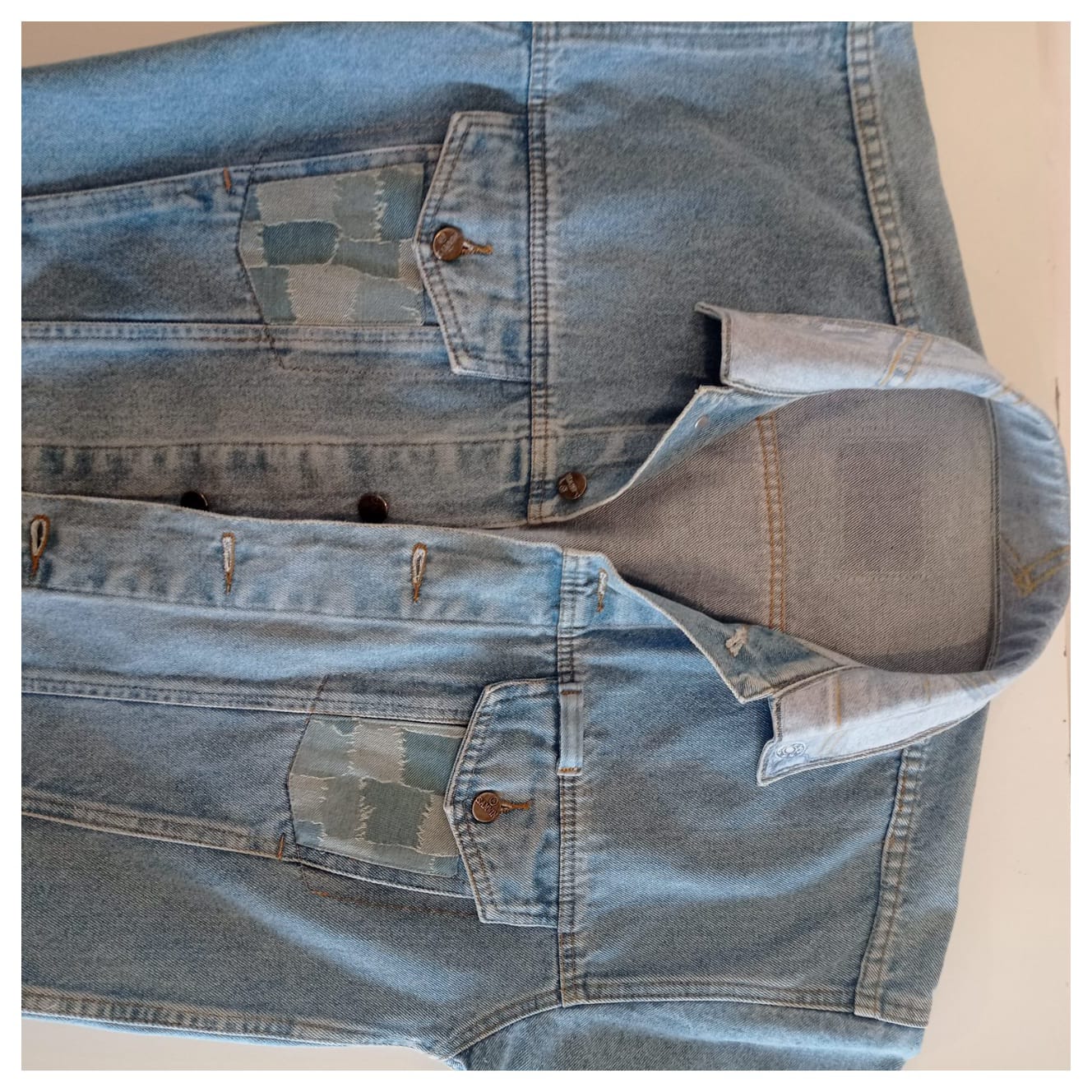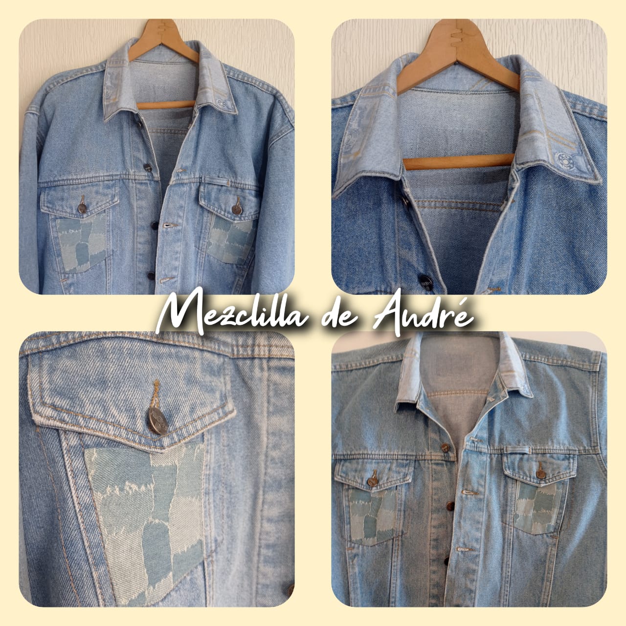 Esta prenda irrepetible y exclusiva, forma parte de la colección exclusiva "Mezclilla de André" que interviene desigualmente cada pieza una por una, en este caso con aplicaciones en tela de mezclilla. Se puede pagar vía Webpay de Transbank hasta en 12 cuotas contado.