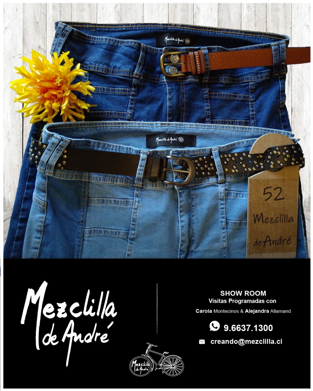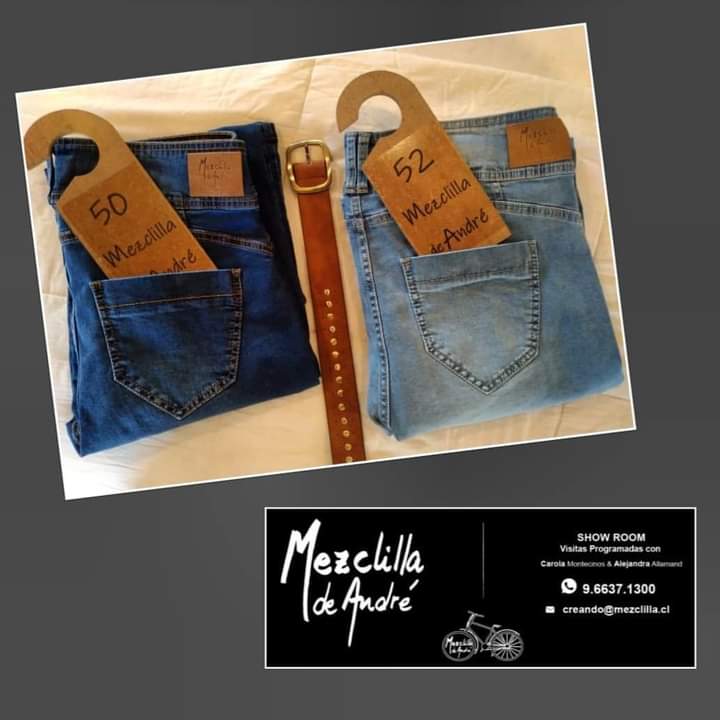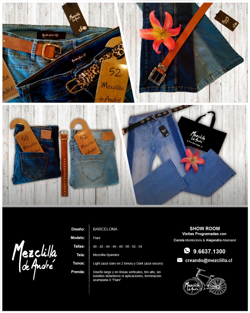 Porque el estilo no tiene talla ni edad, la colección en serie de “Mezclilla de André” presenta este modelo de tiro alto, líneas verticales y terminación acampanada, en tallas de la 40 a la 52, todos en dos colores de mezclilla: Uno celeste combinado y otro en azul índigo. Se pueden pagar vía web-pay de Transbank hasta en 12 cuotas sin intereses.